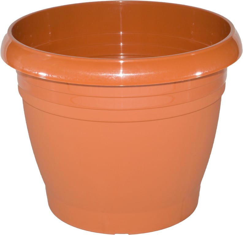 Plastikowa doniczka w kolorze terakota o beczułkowatym kształcie. Doniczka posiada zaznaczone miejsce do samodzielnego wykonania dziurki w celu odpływu nadmiaru wody.