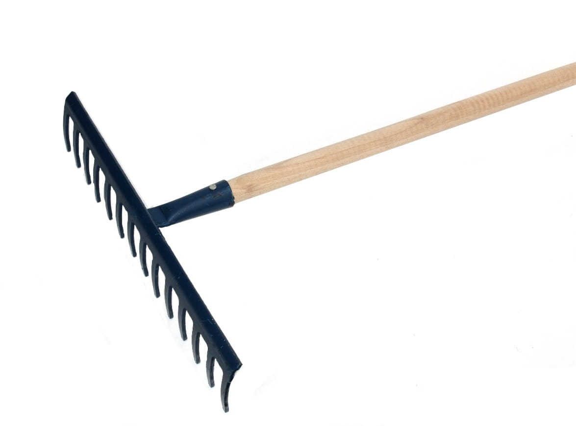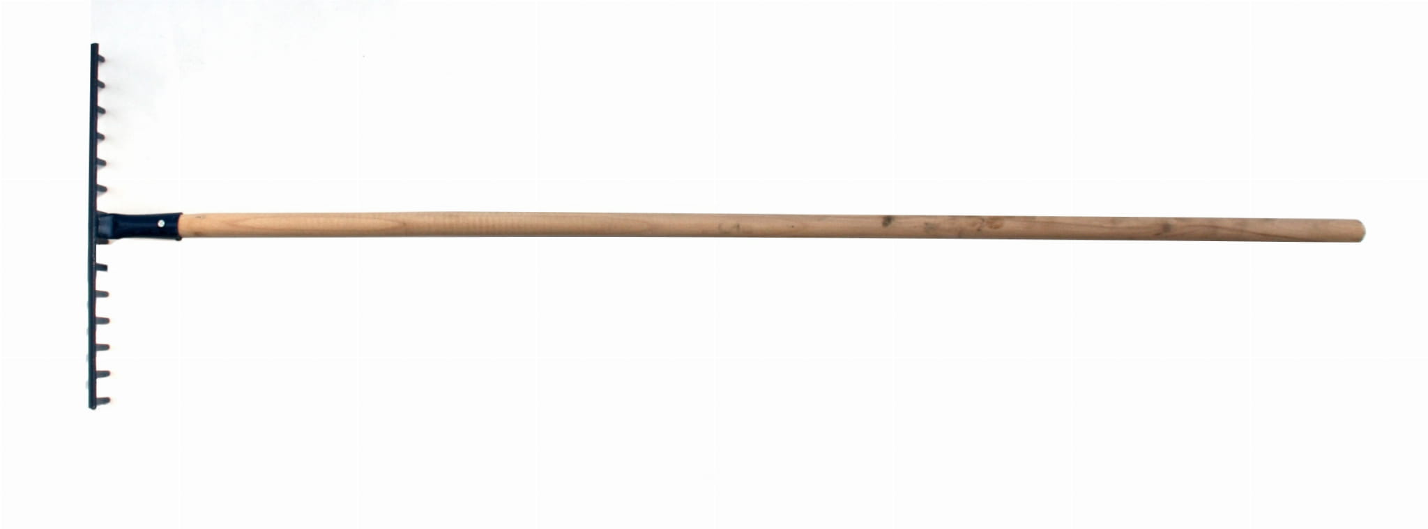 Grabie z długim drewnianym trzonem oraz metalową częścią roboczą składającą się z 16 zębów.