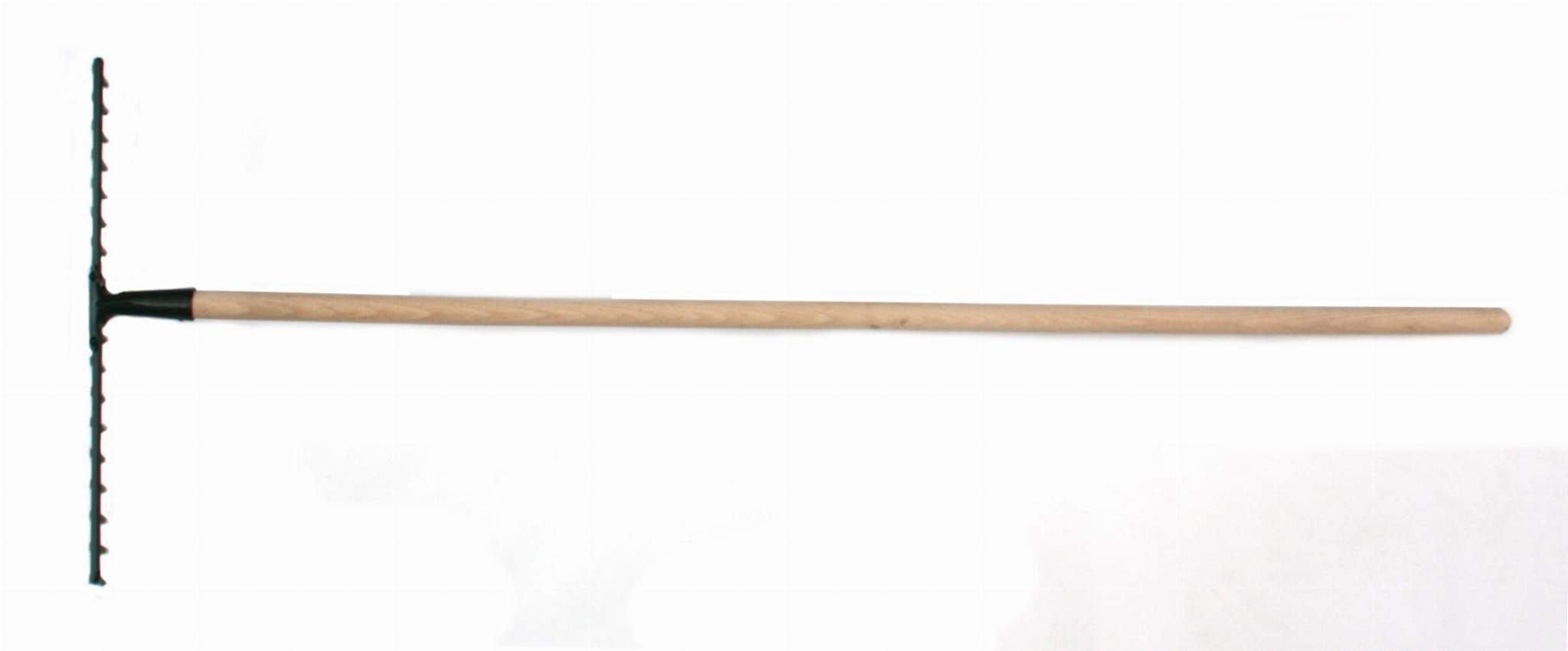 Grabie z długim drewnianym trzonem oraz metalową częścią roboczą składającą się z 18 zębów.