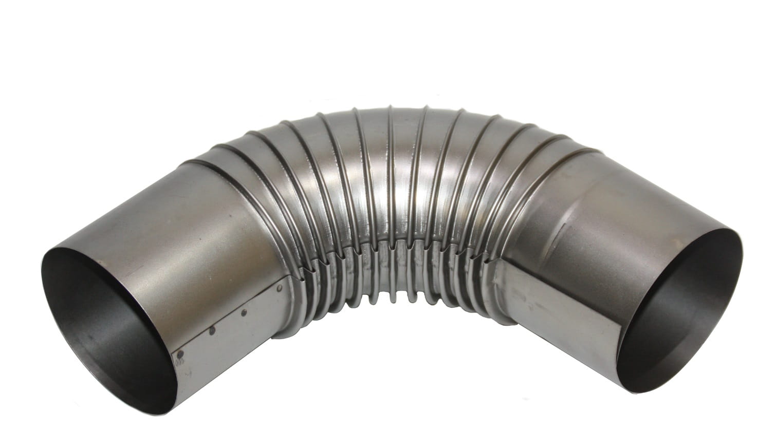 Kolanko wykonane z metalowej blachy zespawanej w odpowiedni kształt. Dodatkowo kolanko posiada prążki dzięki którym łatwo nadaje się mu formę.