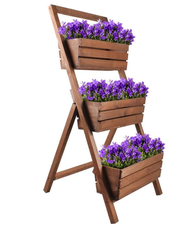 Drewniany kwietnik został w całości wykonany z drewna, co gwarantuje jego solidną konstrukcję, stabilność i odporność na warunki atmosferyczne. Duży stojak drewniany jest przeznaczony na kolorowe kwiaty kwitnące (również te wiszące), rośliny zielone, świeże zioła, a nawet niektóre warzywa hodowane samodzielnie. Wypełniony roślinami kwietnik piętrowy możesz ustawić - jeśli mieszkasz w domu jednorodzinnym - przed wejściem, na tarasie lub w ogrodzie, a jeśli masz mieszkanie w bloku - na balkonie. Dzięki piętrowemu przymocowaniu do stelaża delikatnie zwężających się ku dołowi, zyskujesz dużo miejsca na rośliny i maksymalnie wykorzystujesz często niewielką przestrzeń balkonową. Stojak na rośliny został pomalowany specjalnie przeznaczoną do drewna farbą, dzięki czemu płatki kwiatów oraz zielone łodygi i liście włożonych do niego roślin ładnie wyglądają na tle drewnianego kwietnika, a ich kolory są jeszcze intensywniejsze!