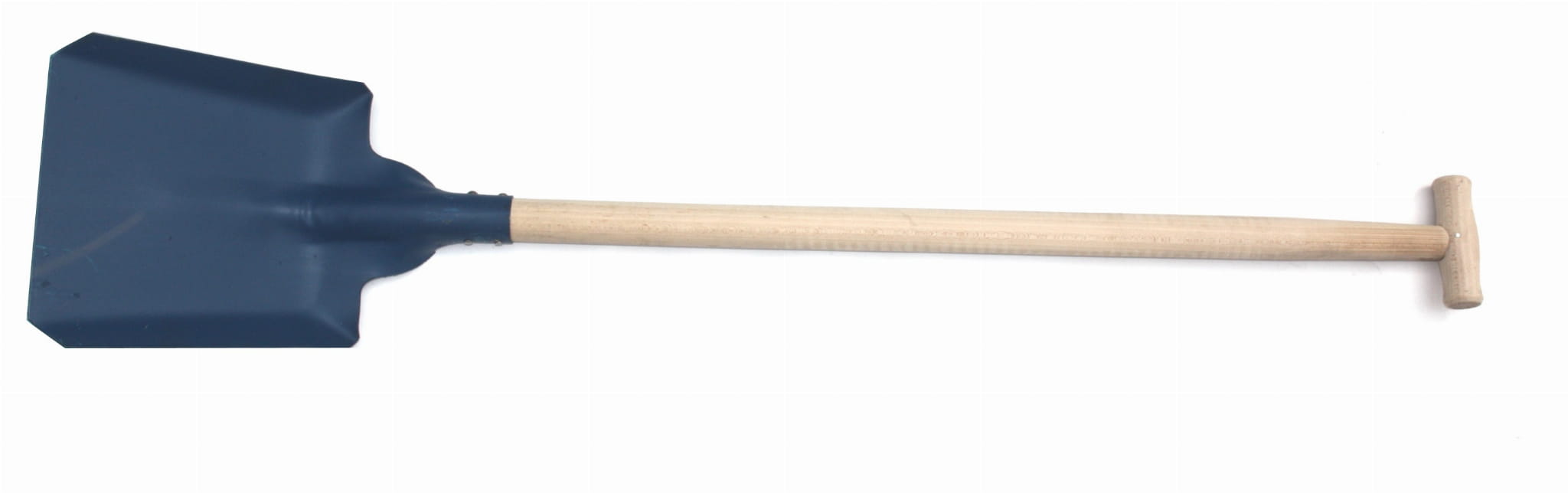 Łopata z drewnianym styliskiem oraz metalową niebieską łyżką posiadającą specjalne wgłębienia. Dodatkowo łopata ma drewnianą płaską rączkę służącą do zawieszania.