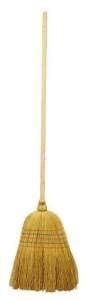 Miotła wykonana z trawy sorgo o krótkim drewnianym trzonku mocowana grubymi niciami oraz metalem.