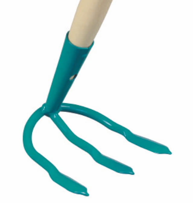 Motyka z metalową częścią roboczą składającą się z 3 zębów oraz z drewnianym trzonem.