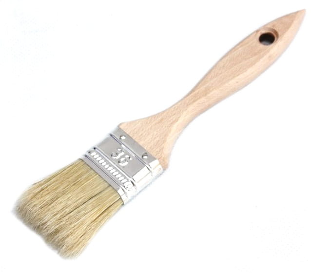 Płaski pędzel typu angielskiego. Skuwka wykonana z ocynkowanej blachy stalowej, a trzonek z drewna bukowego.