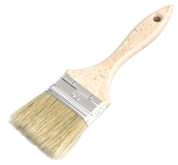 Płaski pędzel typu angielskiego. Skuwka wykonana z ocynkowanej blachy stalowej, a trzonek z drewna bukowego.