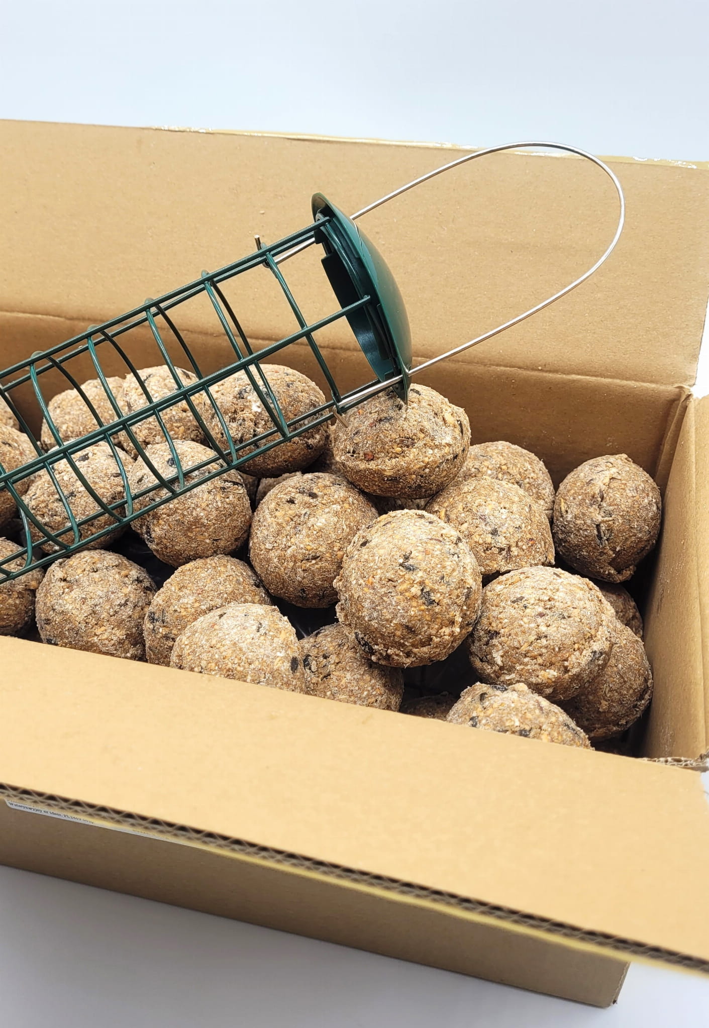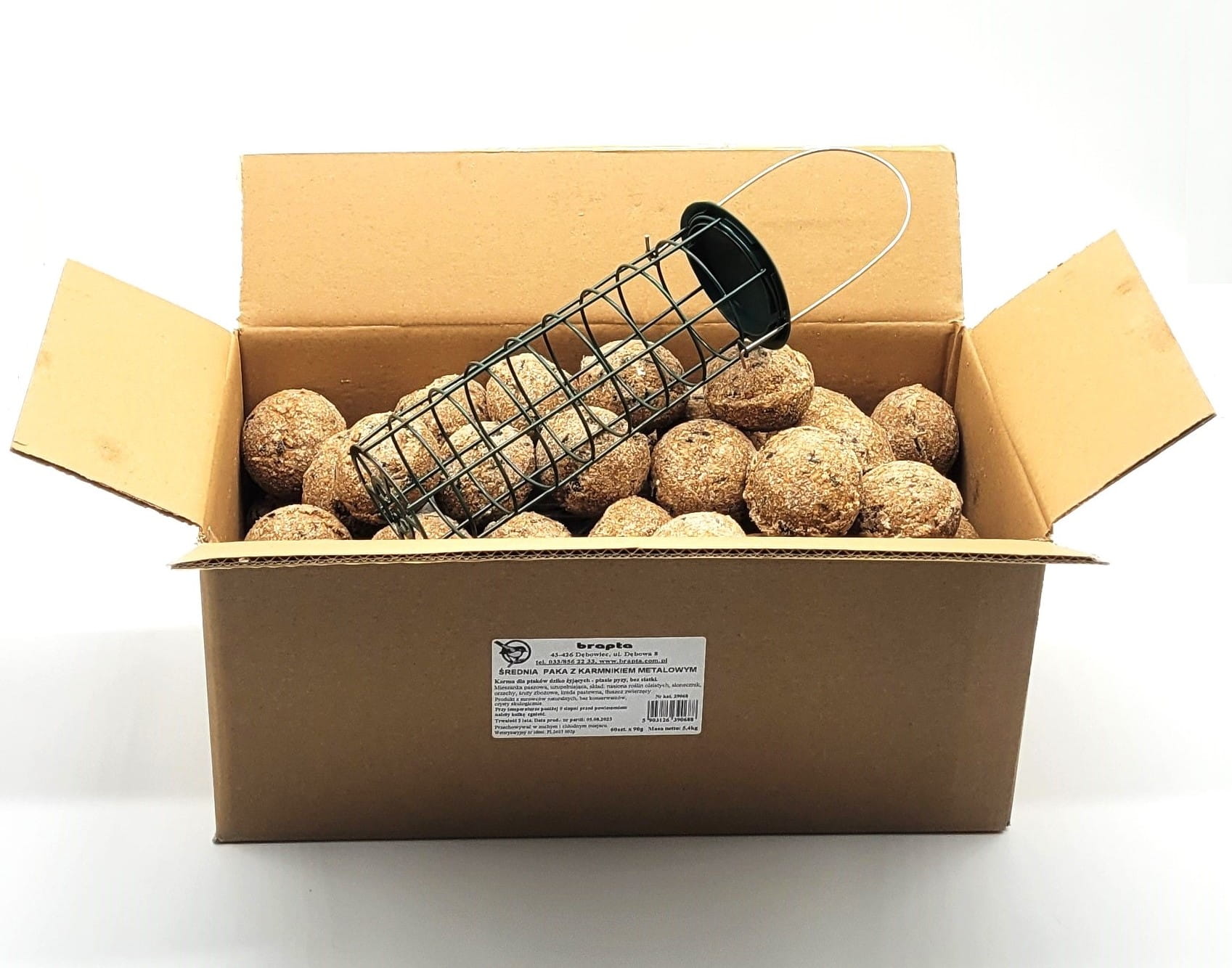 Sposób pakowania: karton w którym znajduje się 60szt ptasich pyz oraz karmnik