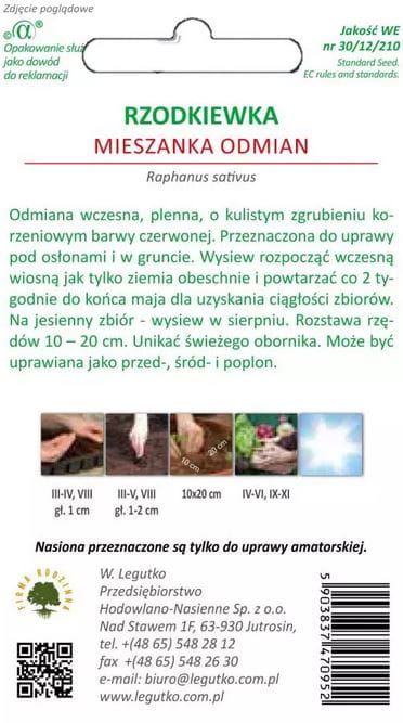 Mieszanka kilku odmian o zgrubieniach okrągłych i zróżnicowanych pod względem barwy skórki oraz smaku miąższu. Doskonale nadają się do kolorystycznego i smakowego wzbogacenia potraw. Na zbiór wiosenny, nasiona wysiewać od początku marca do końca maja, na zbiór letni w sierpniu. rozstawa rzędów 10 - 20 cm. Unikać świeżego obornika. Może być uprawiana jako przed-, śród- i poplon.