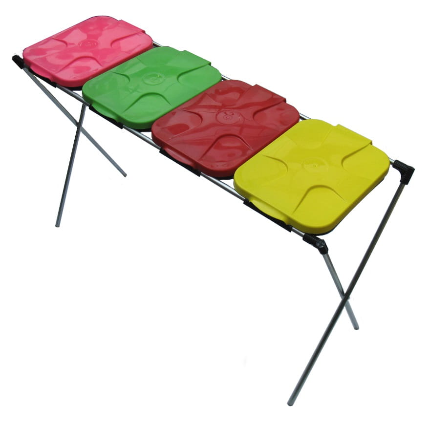 Stojak wykonany z rurek nierdzewnych z zaślepkami oraz różnokolorowymi pokrywami z tworzywa sztucznego