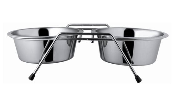 Stojak metalowy z antypoślizgowymi gumowymi nóżkami + dwie miski ze stali nierdzewnej.