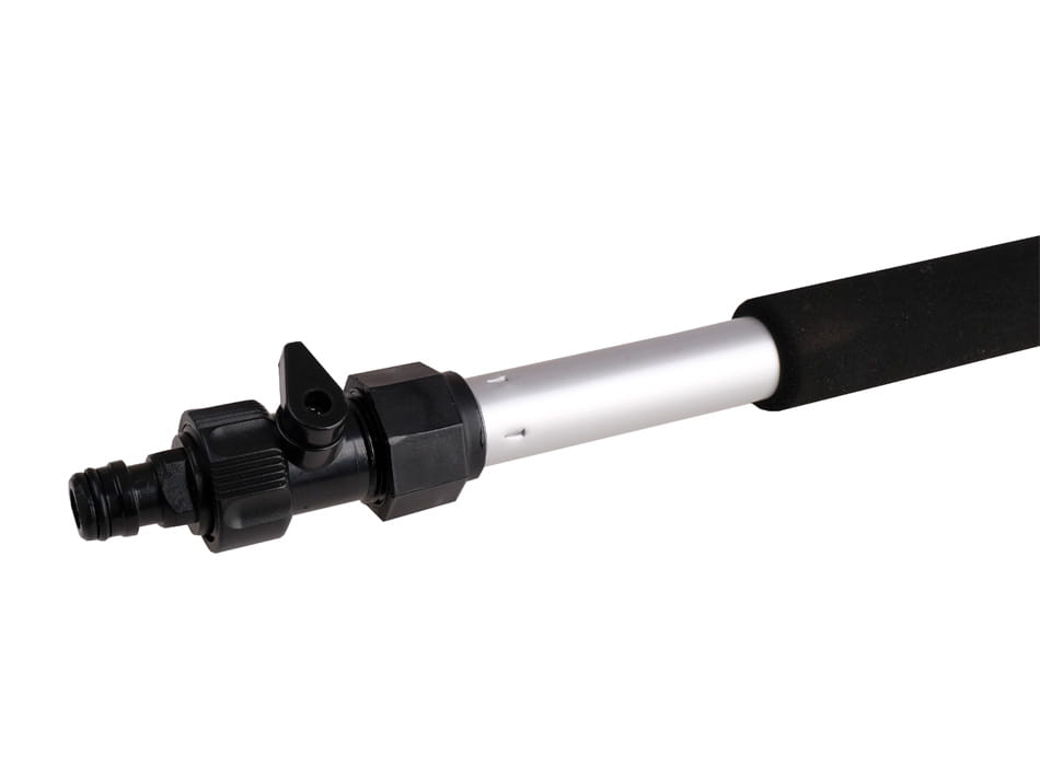 Szczotka uniwersalna do mycia samochodu posiada trzonek teleskopowy oraz miejsce do podłączenia węża ogrodowego. Zakończona została wejściem na szybkozłącze oraz posiada zawór pozwalający swobodnie odcinać dopływ wody.